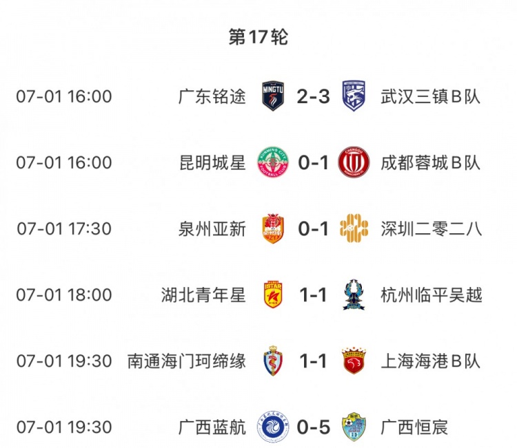 7月1日讯 中乙第17轮今天展开6场比赛的较量,广西德比广西恒宸5-0大胜广西蓝航,蓉城B队1-0昆明城星。
